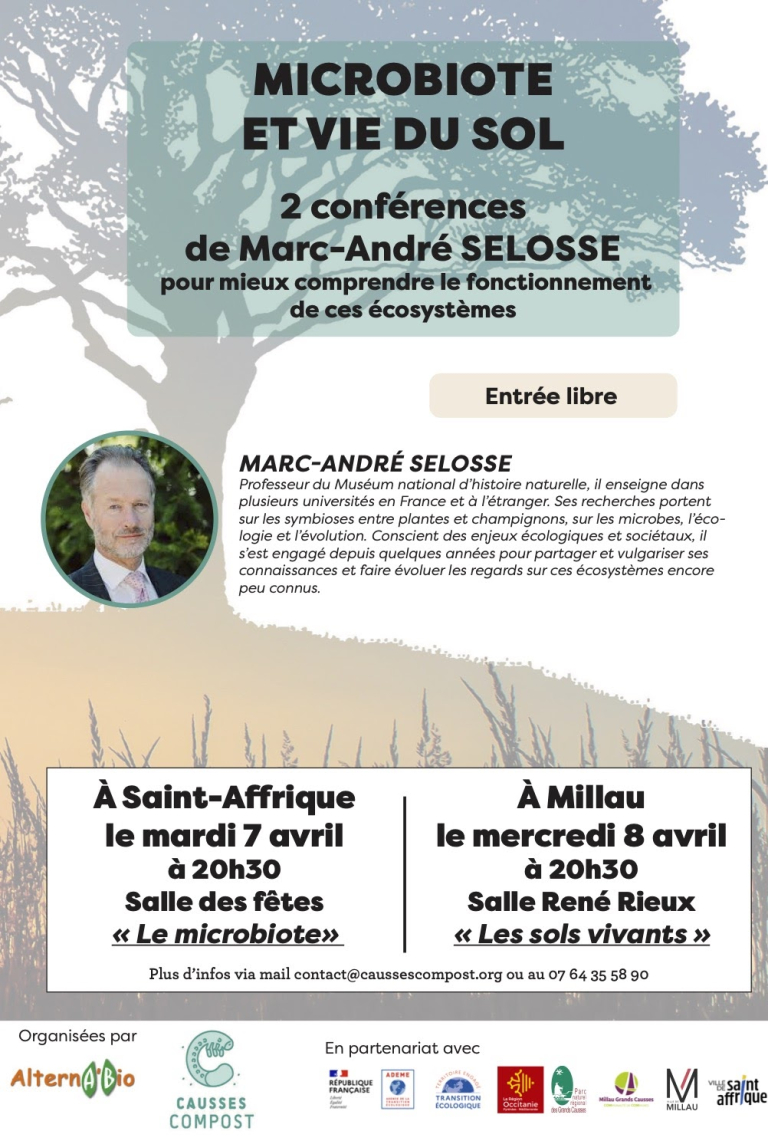 Rejoignez-nous en compagnie de Marc-André Selosse qui nous a fait l’honneur de répondre à l’invitation d’ALTERNABIO et de CAUSSE COMPOST pour 2 conférences en sud Aveyron : A Saint-Affrique le mardi 7 avril à 20h30 à la salle des fêtes : « Le microbiote » A Millau le mercredi 8 avril à 20h30 à la salle […]