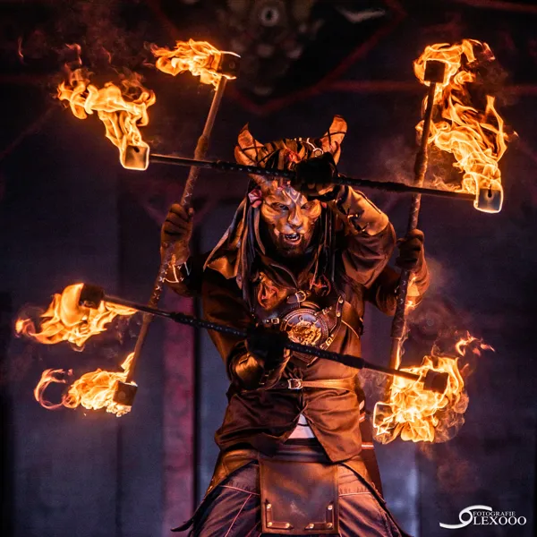 Bienvenue dans un monde où feu, mouvement et rituel s’entrelacent. Des créatures surgissent d’un portail monumental : elles s’affrontent dans une danse de flammes, entre puissance et élégance.