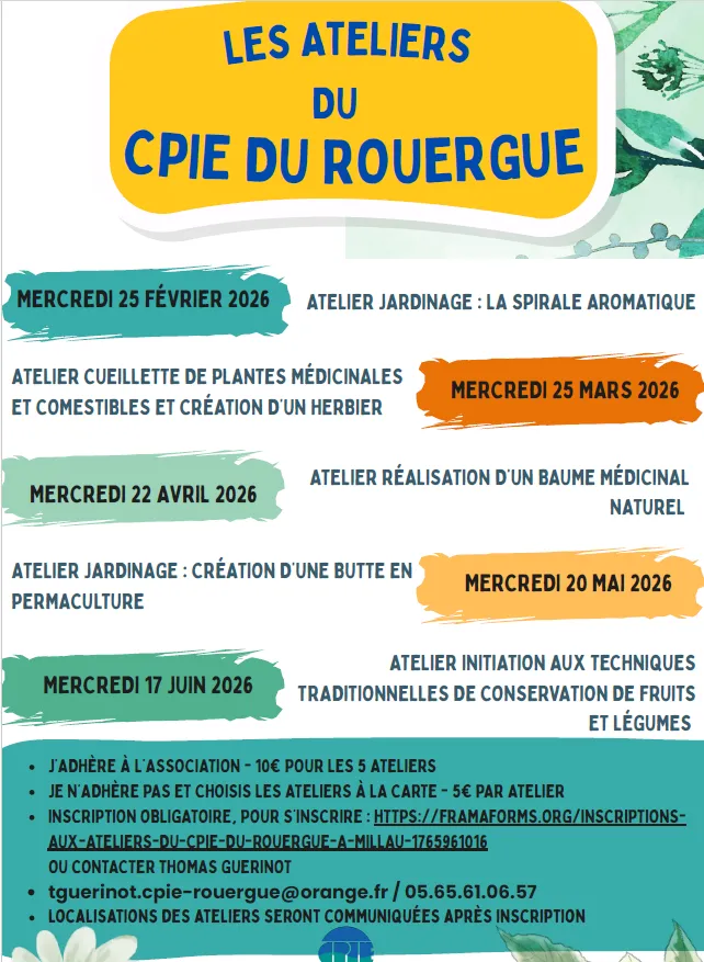 Les ateliers se déroulent sur différents lieux à et autour de Millau, de 14h à 16h30, et sont conçus pour permettre à chacun de repartir avec des connaissances concrètes et applicables au quotidien.
